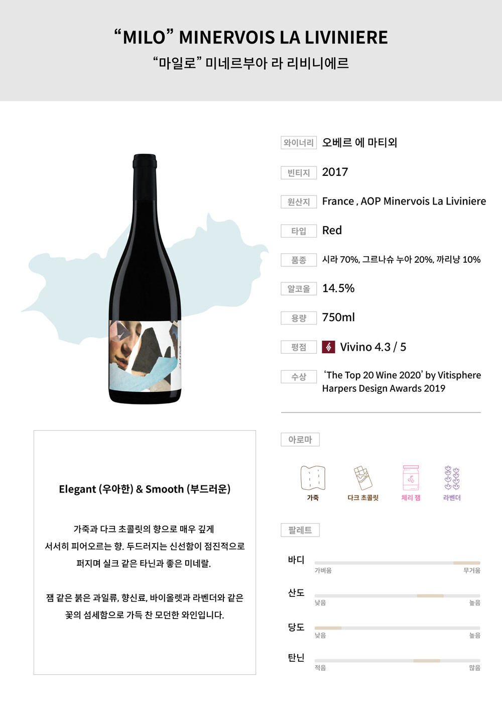 가죽과 다크 초콜릿의 향으로 매우 깊게 서서히 피어오르는 향. 두드러지는 신선함이 점진적으로 퍼지며 실크 같은 타닌과 좋은 미네랄. 잼 같은 붉은 과일류, 향신료, 바이올렛과 라벤더와 같은 꽃의 섬세함으로 가득 찬 모던한 와인입니다.