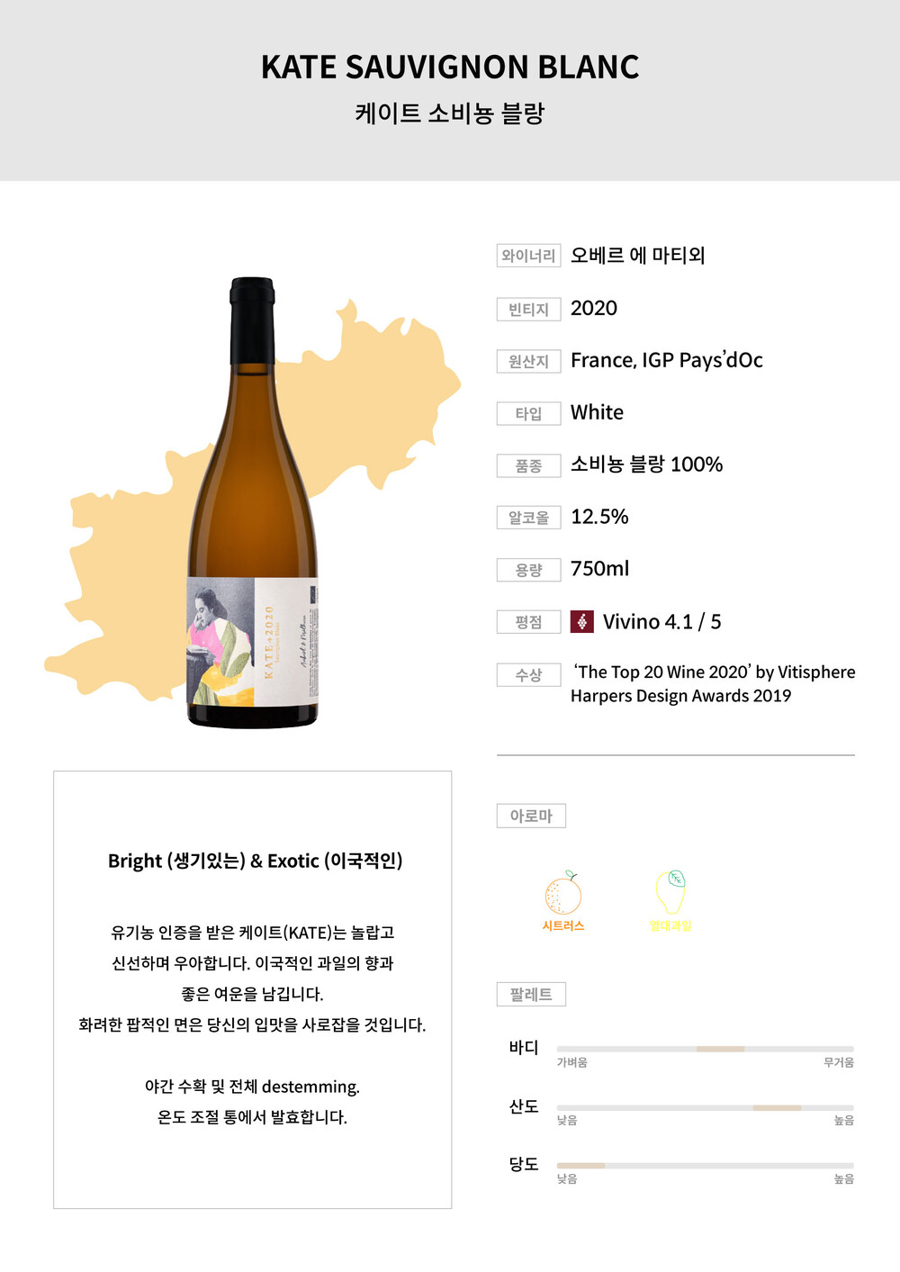 유기농 인증을 받은 케이트(KATE)는 놀랍고 신선하며 우아합니다. 이국적인 과일의 향과 좋은 여운을 남깁니다. 화려한 팝적인 면은 당신의 입맛을 사로잡을 것입니다.