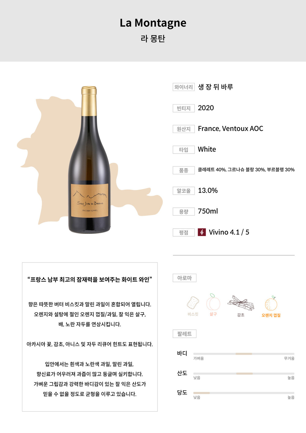 ■Grapes: 클레레트 40%, 그르나슈 블랑 30%, 부르블랭 30%