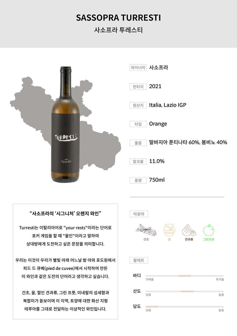 건초, 꿀, 절인 견과류, 그린 프룻, 미네랄의 섬세함과 복합미가 돋보이며 이 지역, 토양에 대 한 화산 지형 테루아를 그대로 전달하는 이상적인 와인입니다.