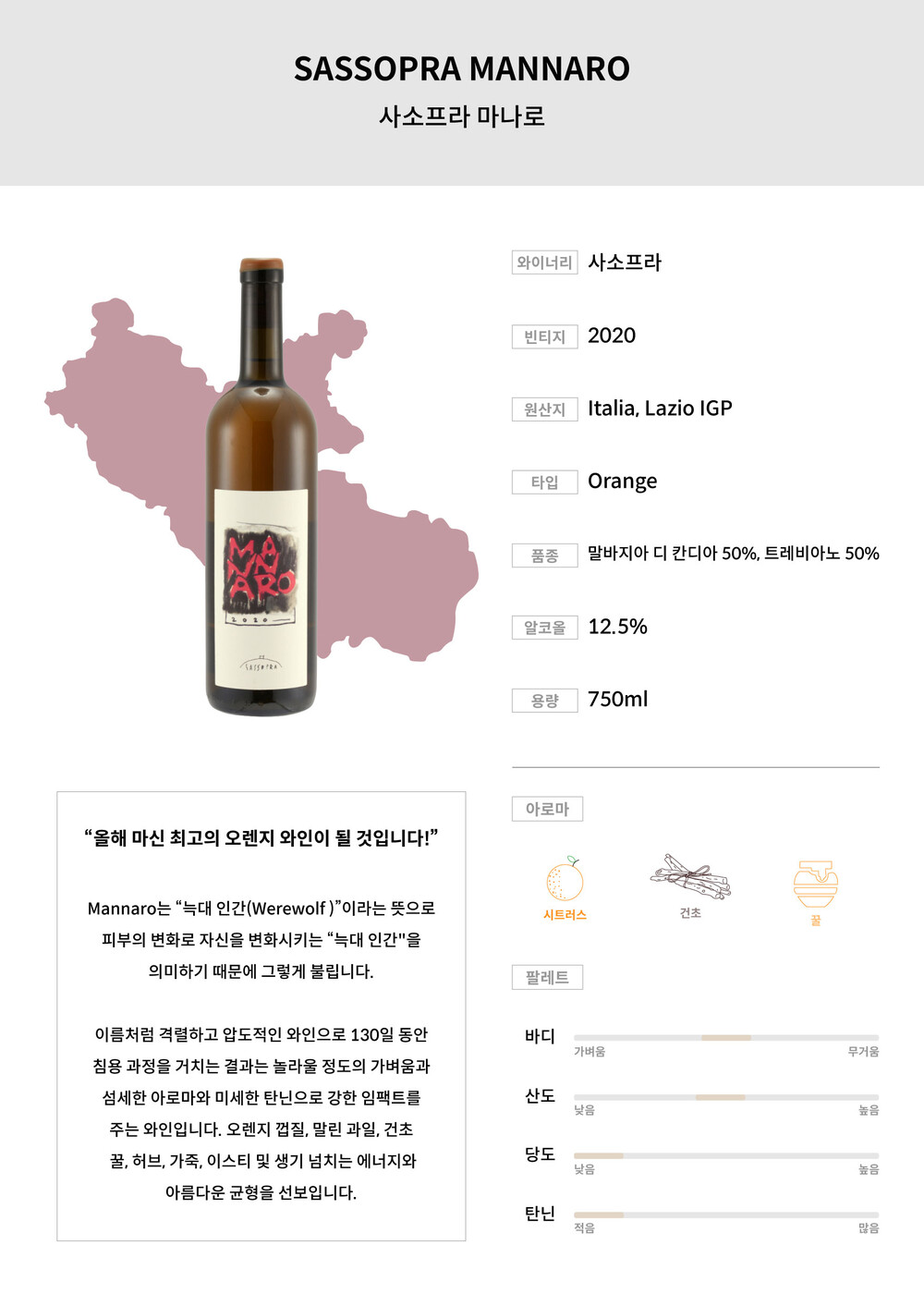 ■Mannaro는 “늑대 인간(Werewolf )”이라는 뜻으로 피부의 변화로 자신을 변화시키는 “늑 대 인간"을 의미하기 때문에 그렇게 불립니다. 이 와인과 같이 포도 껍질을 침용하면 침용된 포도주가 되듯이요.
