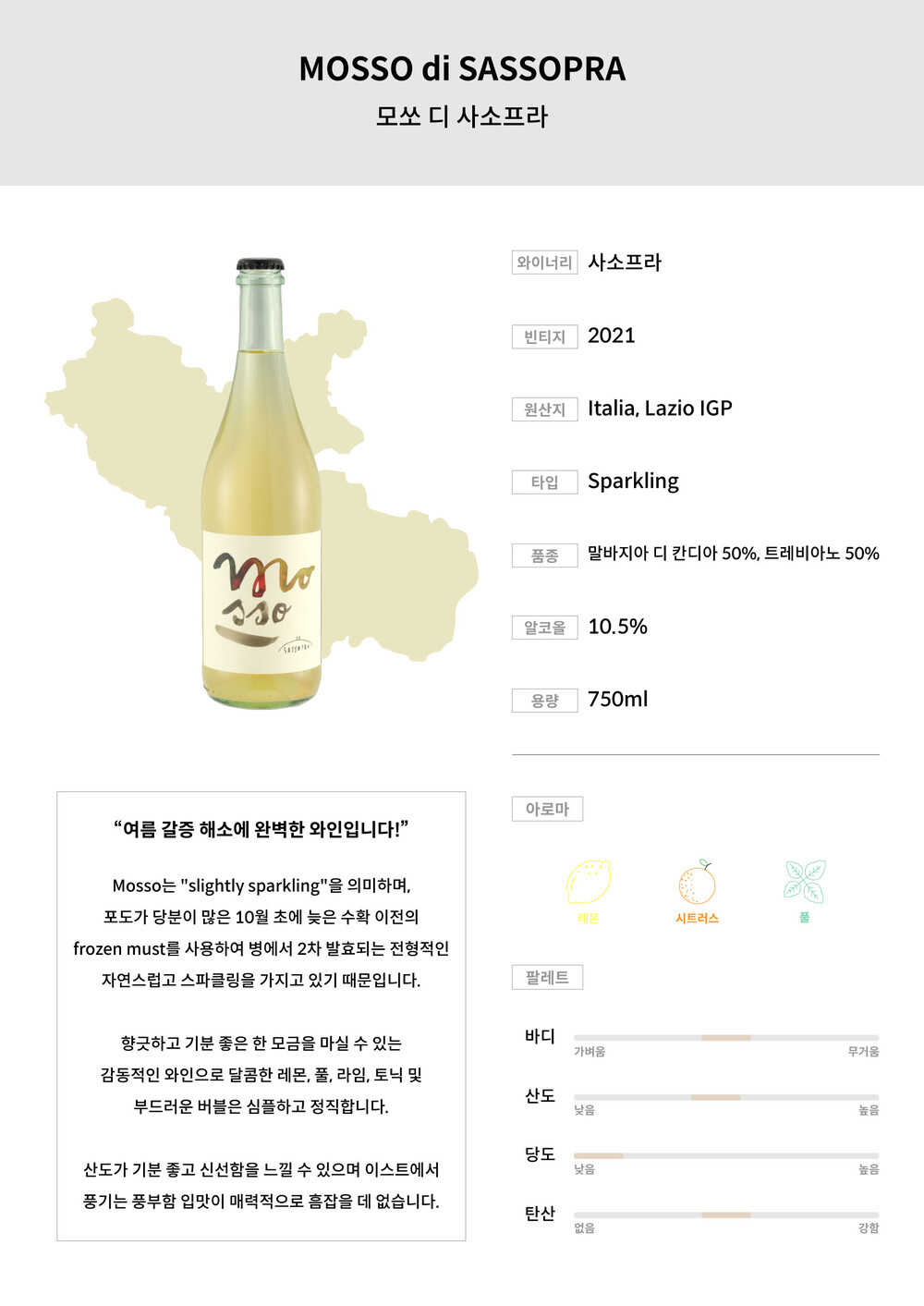 ■Mosso는 "slightly sparkling"을 의미하며, 포도가 당분이 많은 10월 초에 늦은 수확 이 전의 frozen must를 사용하여 병에서 2차 발효되는 전형적인 자연스럽고 스파클링을 가지 고 있기 때문입니다.